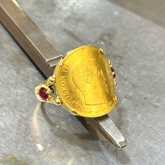 Bague Pièce - Or Jaune 750 Pièce 10 Francs Napoléon & Rubis