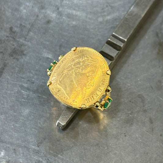 Bague Pièce - Or Jaune 750 Pièce 10 Francs Napoléon & Émeraudes
