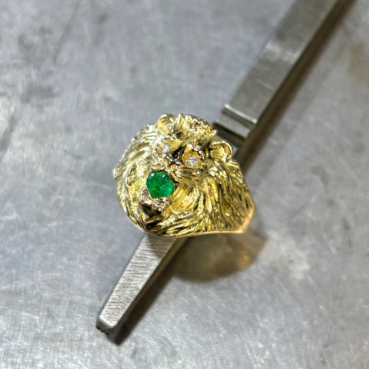 Bague Chevalière Lion - Or Jaune 750 Diamants & Émeraude