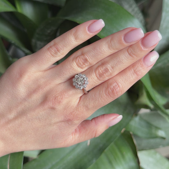 Pierres : Diamant naturel central taille ancienne 0ct40, entouré de 10 diamants naturels taille ancienne pour un total de 0ct50. Total diamants 0ct90.