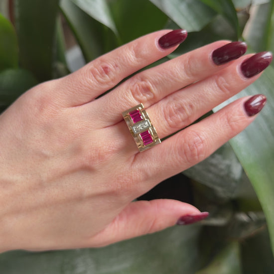 Bague Tank Art Déco - Or Jaune 750 Diamants & Rubis